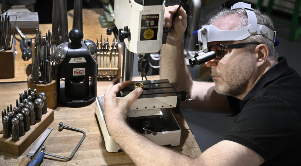 Platinum is central to Tom’s work. Recently his experimentation with producing colour in platinum has paid off. The process is, needless to say, top secret but what he can divulge is that he is now able to ‘manipulate’ the appearance of this famously white metal and create vivid colours.
