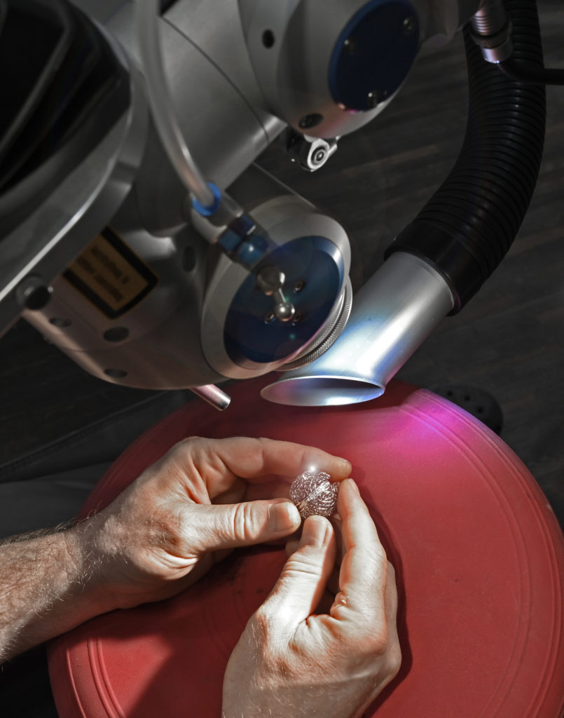 His intricate work is so fine that each piece has to be predominantly constructed using a microscope. Many of his works contain more than 10,000 single laser spot welds, some containing up to two million.