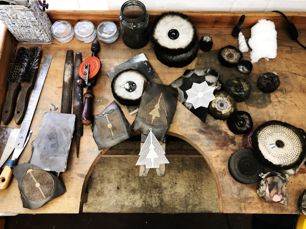 Ben’s aim is to create beautifully functional objects without compromising on aesthetics. He always work on paper first and then movs onto the computer to figure out how he’s going to make a piece. His inspiration is often lead by a commission brief or interesting objects that he’s have seen. The process of making jewellery and silverware traditionally from the bench, coupled with cutting edge manufacturing techniques, helps him to produce unique items. Ben often tries to mechanically assemble pieces where possible, so he can combine different surface finishes and textures, to help accentuate form or to play with reflections.