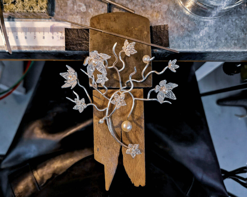 Descending from a textile-producing family, Indonesia-born Jewellery designer-maker Edwin Charmain specialised in the ancient art of filigree making. By twisting and compressing fine wires, Charmain creates elaborate ornamentations whose design and shape were born from the amalgamation of his country’s batik motifs/iconography with unique sequences found in natural objects and buildings.