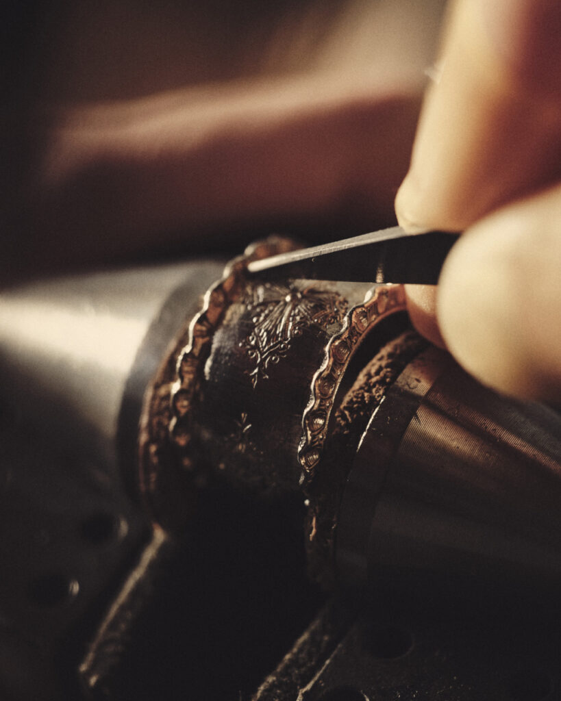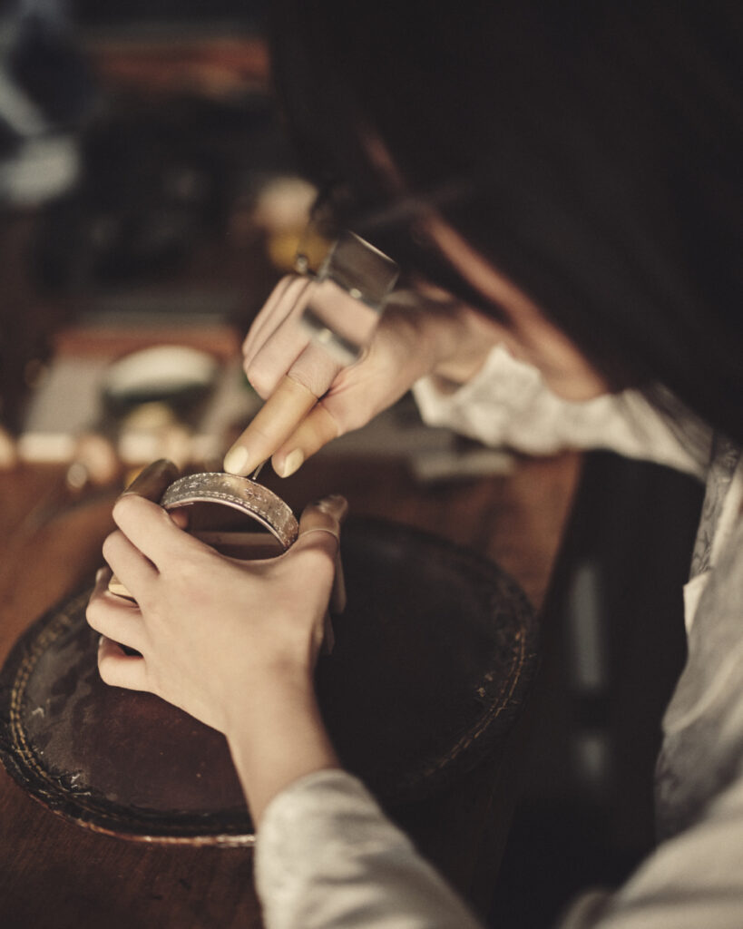 Epona Smith is a London based jeweller and hand-engraver, who specialises in traditional, Italian hand-push engraving. She transforms traditional heirlooms into contemporary jewellery by utilising ancient skills to create modern classic. She engraves precious metals with textures of silk and velvety finishes, as well as decorative patterns of floral, infinite and damask motifs, creating unique and distinctive pieces. She discovered her passion for hand-engraving in Florence, Italy and skilfully merges the classic European technique elements with a sophisticated oriental attitude.