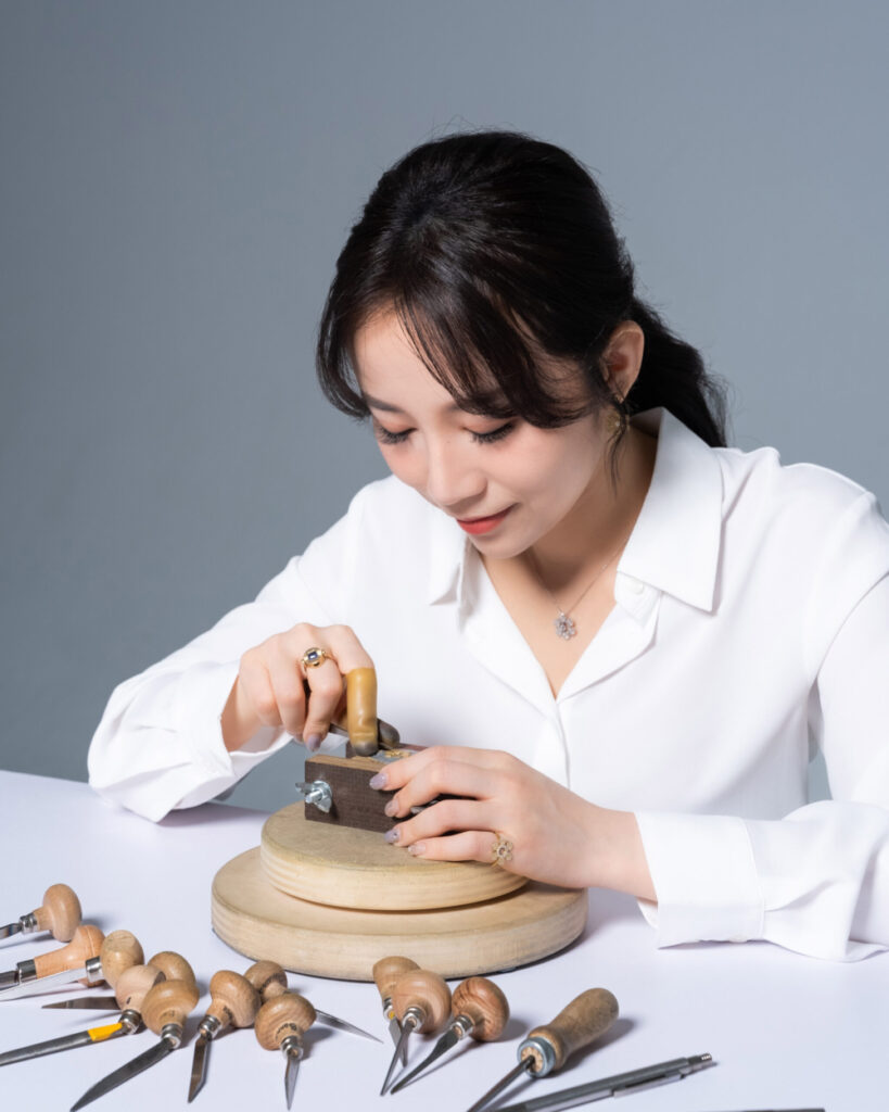 She has won numerous awards such as The Goldsmiths’ Craft and Design Council Hand Engraving Bronze Award and Queen Elizabeth Scholarship Trust Award. She was the winner of Collect Art Fair 2023 – Collect Open for her art installation “A Ladies Boudoir”. The judges lauded the original idea as expertly executed and displaying “many levels of craftsmanship and complexity of processes”. She states: “My work is not only to integrate the beauty of European and Asian cultures, but also to redefine the way of story telling of traditional culture and create a new aesthetic.”
