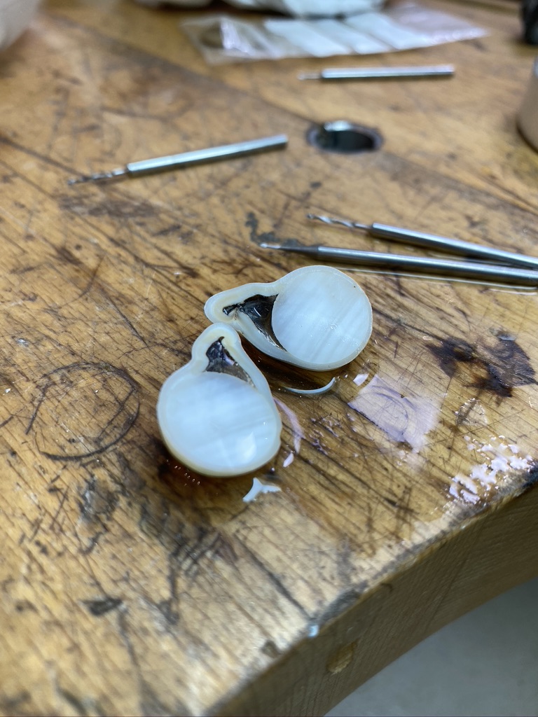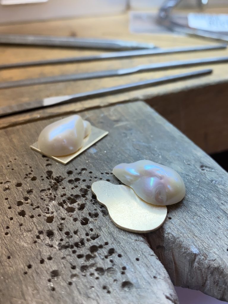 Driven by an interest in process, Holly’s pieces aim to blur the line between fine and contemporary jewellery, offering a new take on the archetypes found within traditional jewellery. The way in which we interact with everyday objects, the skewed associations and feelings that the familiar can evoke is central to her work. Her playful designs explore the flux between creation and destruction, drawing attention to the everyday by framing the unseen. Pearls are an integral focus of Holly’s work. Through various processes such as piercing, slicing and stone grinding, she aims to disrupt the traditional preconceptions of these natural forms. Each pearl is set using a practical, functional element in order to juxtapose their contradictory or opposing values.