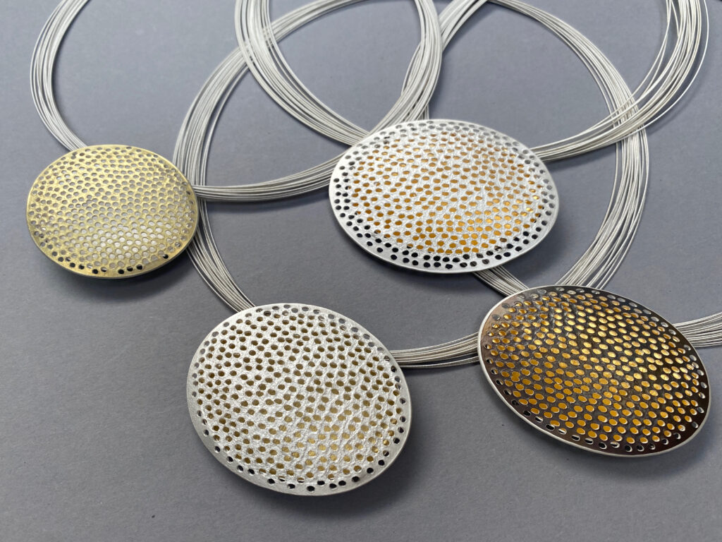 Jane Adam is renowned for her distinctive work in dyed anodised aluminium and in precious metals. Her jewellery explores balance—between symmetry and irregularity, surface and structure, personal and universal. Jane’s pieces are deeply connected to the wearer, combining technical mastery with emotional resonance. Her work is held in numerous major collections including the V&A, Goldsmiths’ Company and Crafts Council. A celebrated figure in contemporary jewellery, Jane continues to challenge perceptions of preciousness through colour, form and thoughtful design.