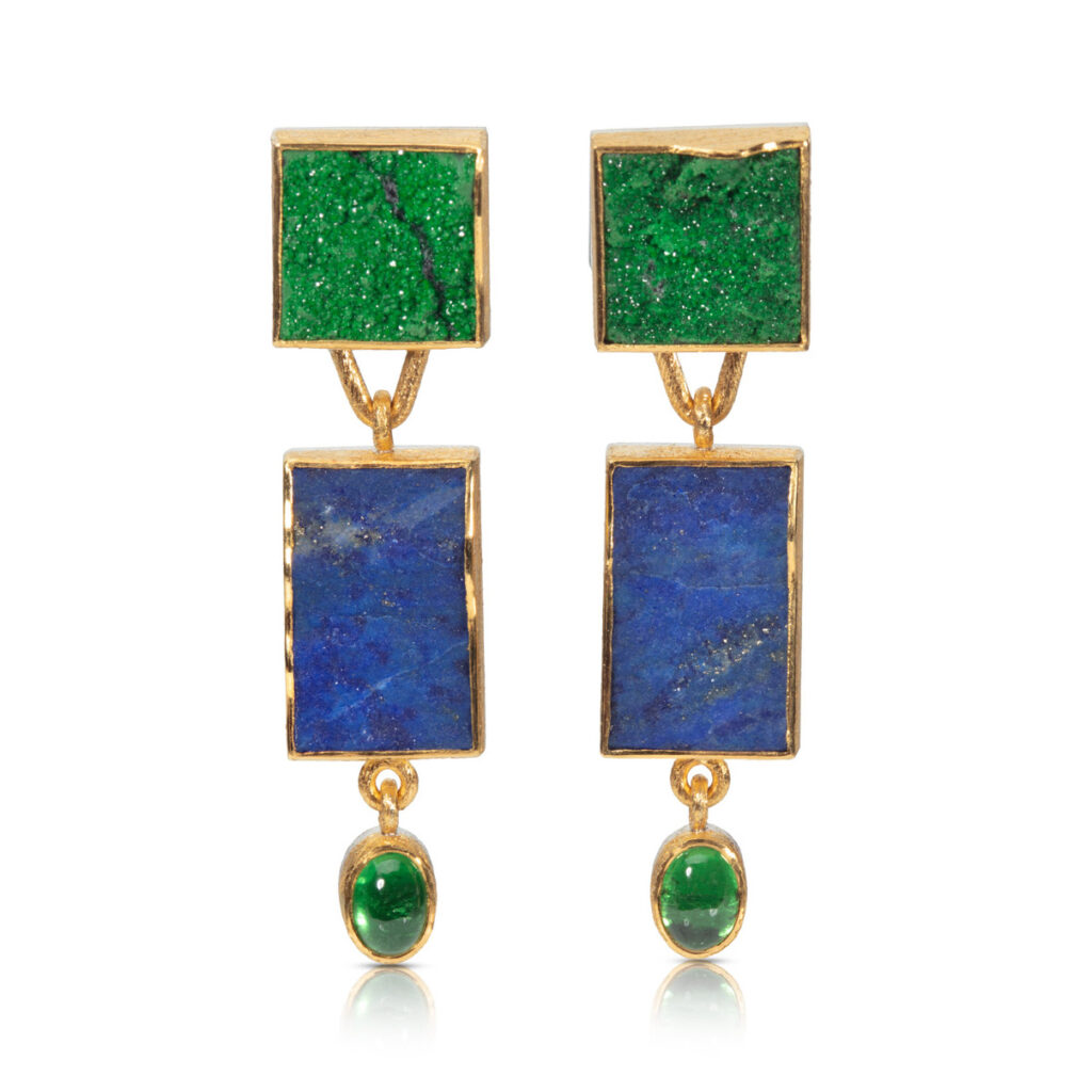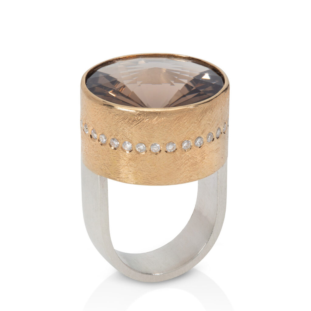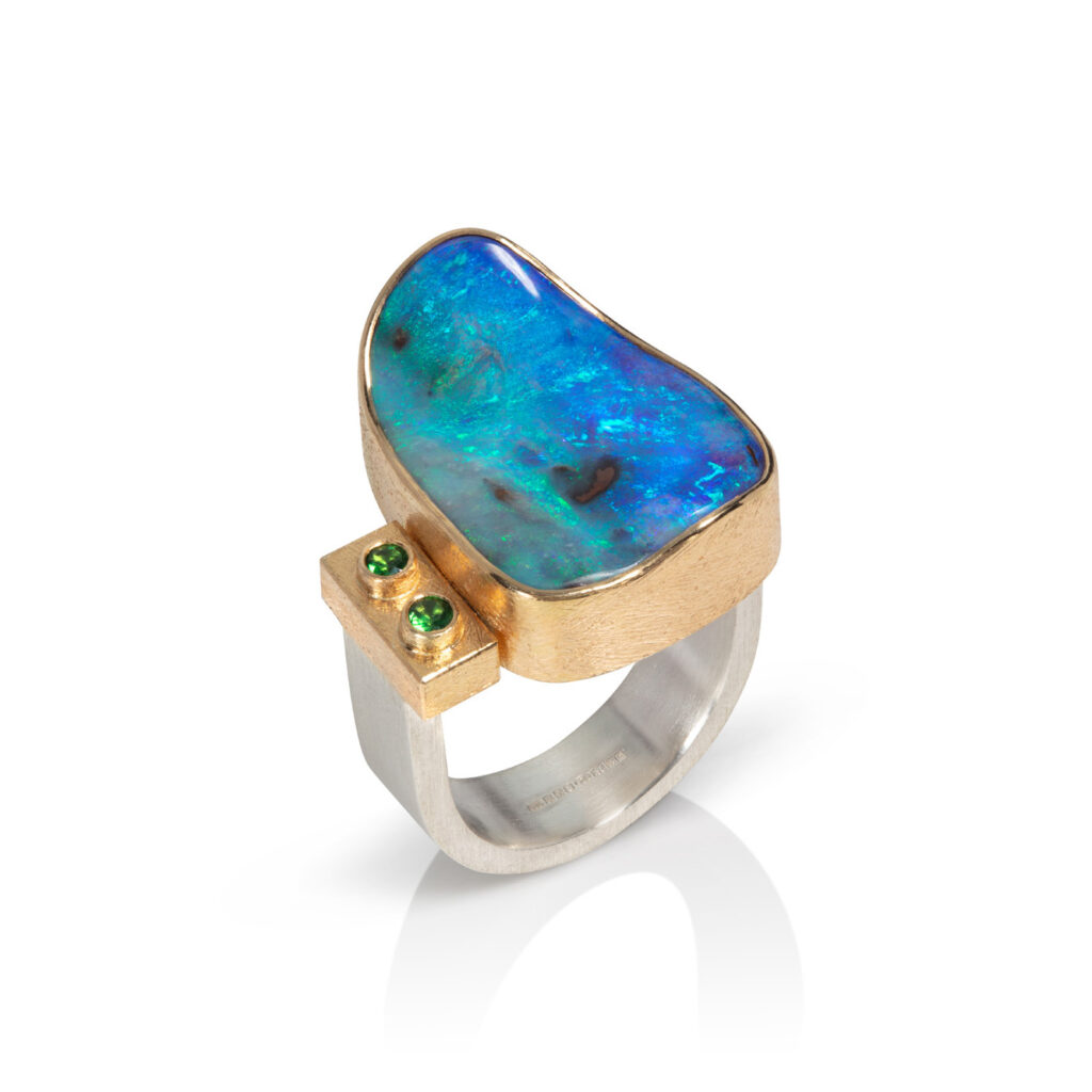 The abstract texture that results reveals the intense colour of the 24ct gold, while contrasting with the gentle and cool shimmer of the silver. Vibrant gemstones, carefully chosen for their unique quality and cut, form the central aspect of every piece.