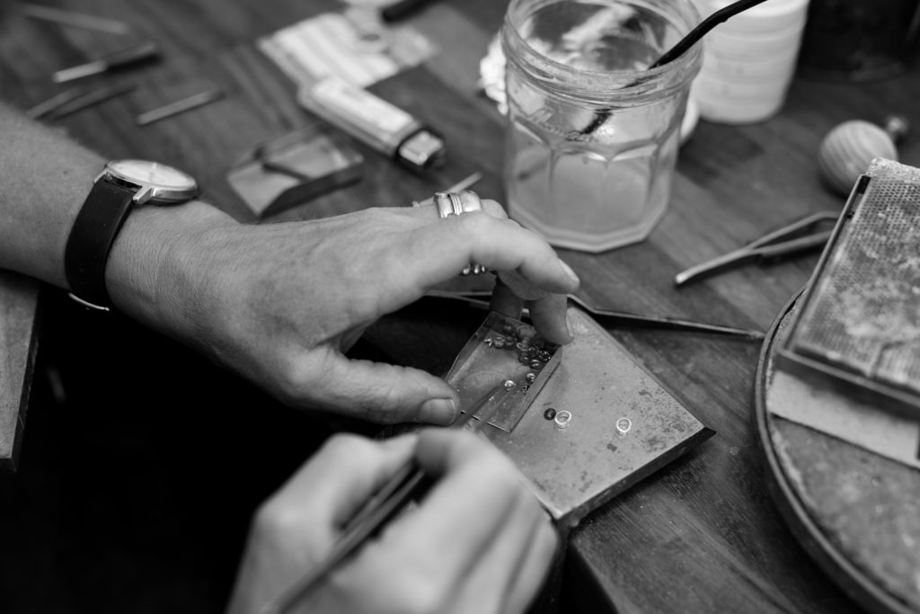 Rather than drawing or working with wax, Tina prefers to work directly with the metal – shaping and filing until she gets it right. Often buying a stone before she has an idea of how she’ll use it, she’ll create a bespoke piece around the unique features of the particular stone. She wonders if this is the most productive method, but having been traditionally trained she loves to get straight into the making and seeing where the process takes her.