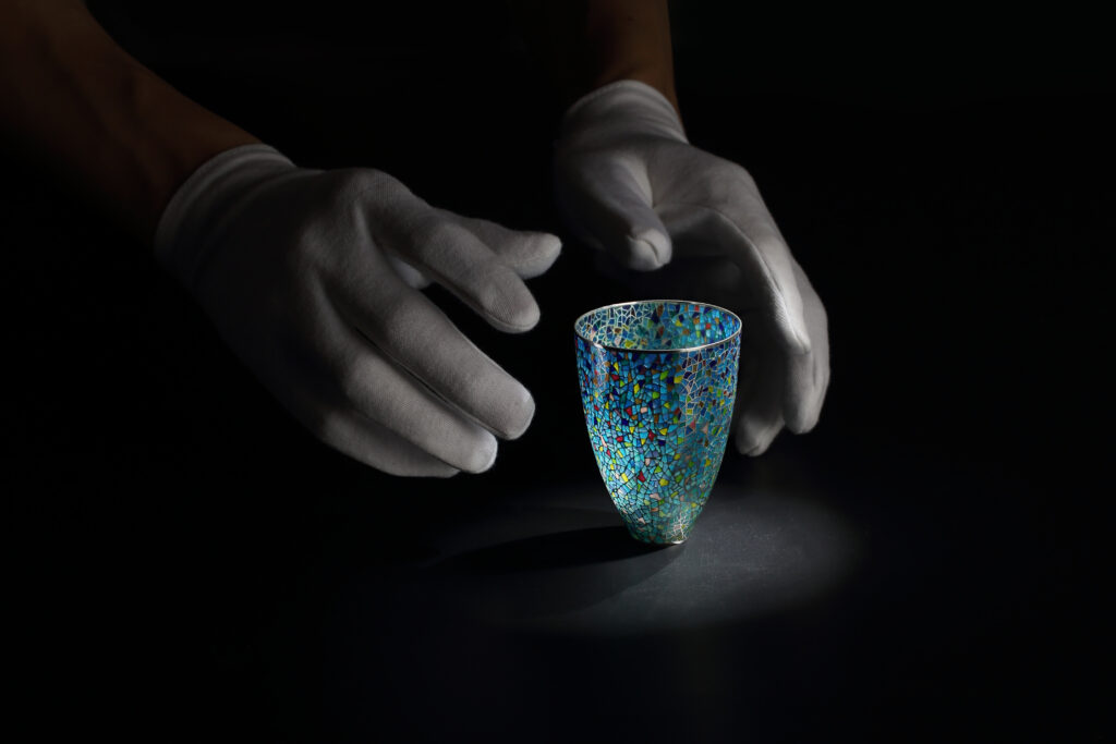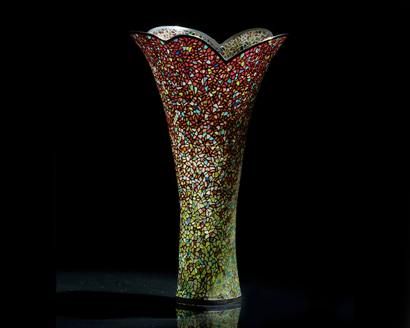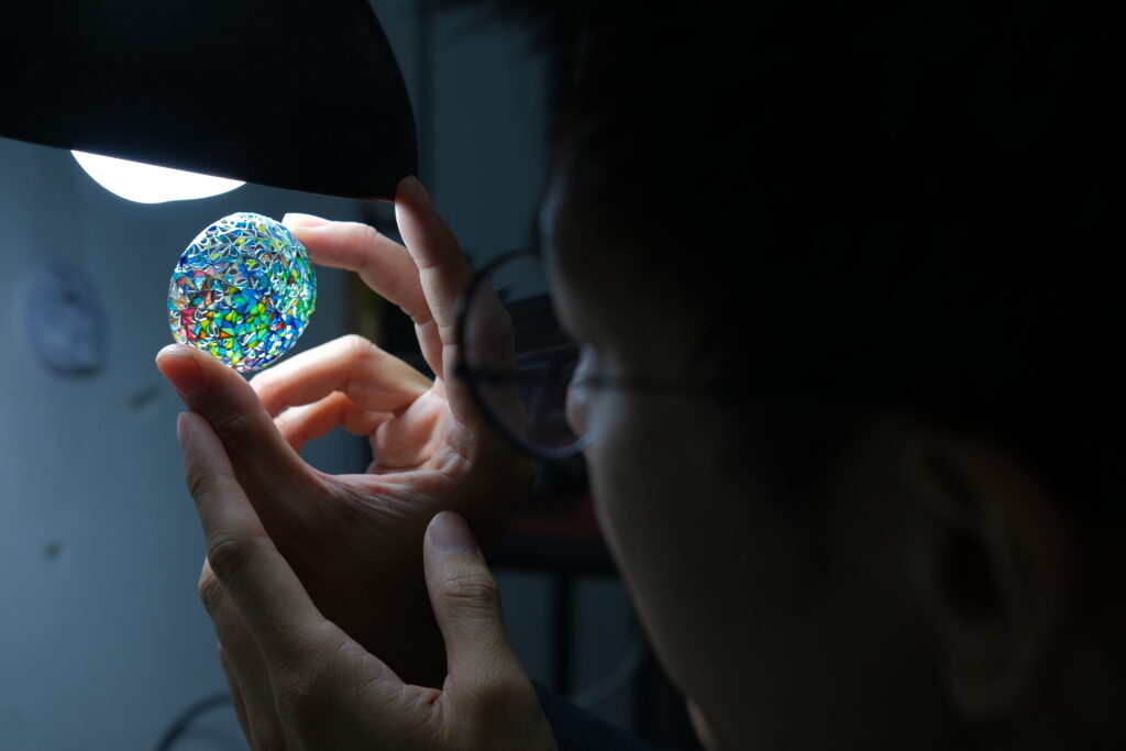 Yinglong Li’s process of making the I-PAJ series includes drawing design sketches; creating a metal framework with very thin silver wires; applying and melting different vitreous enamels; and polishing. To achieve the high finish of his works, Yinglong precisely apply the different-coloured enamels into the holes of the framework and understands each enamel’s melting time. He describes this process as “a big challenge”!